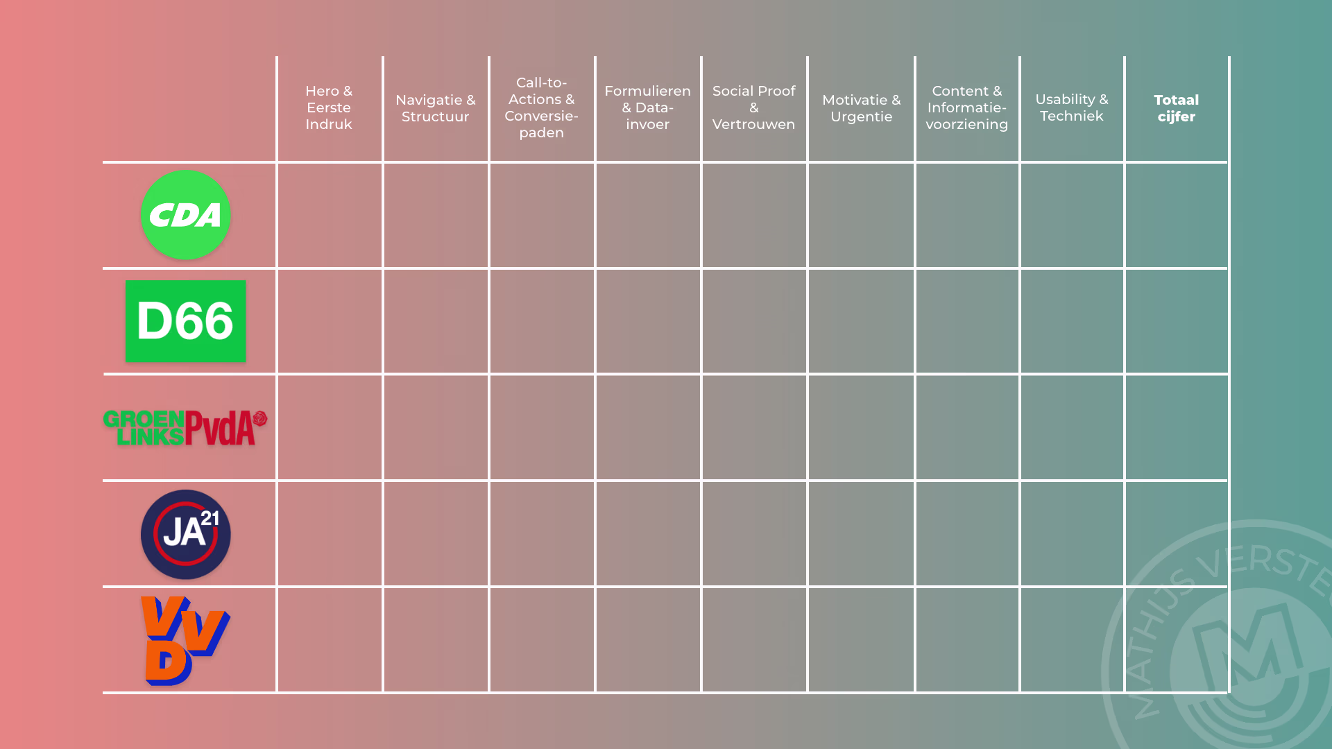 Om de websites van politieke partijen eerlijk en consistent te analyseren, gebruik ik een scorecard die gebaseerd is op CRO-principes (Conversion Rate Optimization). Daarbij kijk ik niet alleen naar wat er aanwezig is, maar ook naar hoe belangrijk elk onderdeel is voor de gebruikerservaring en de online strategie van een partij.